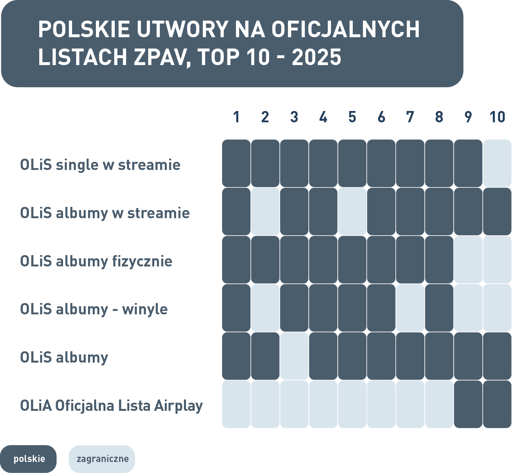 Podsumowanie rocznych zestawień list OLiS dostępne jest na stronie: https://zpav.prowly.com/446106-polska-muzyka-rzadzi-w-streamingu-i-sprzedazy-fizycznej-w-radiu-prym-wciaz-wiedzie-muzyka-z-zagranicy-zpav-podsumowal-2025-rok-na-oficjalnych-listach-sprzedazy.