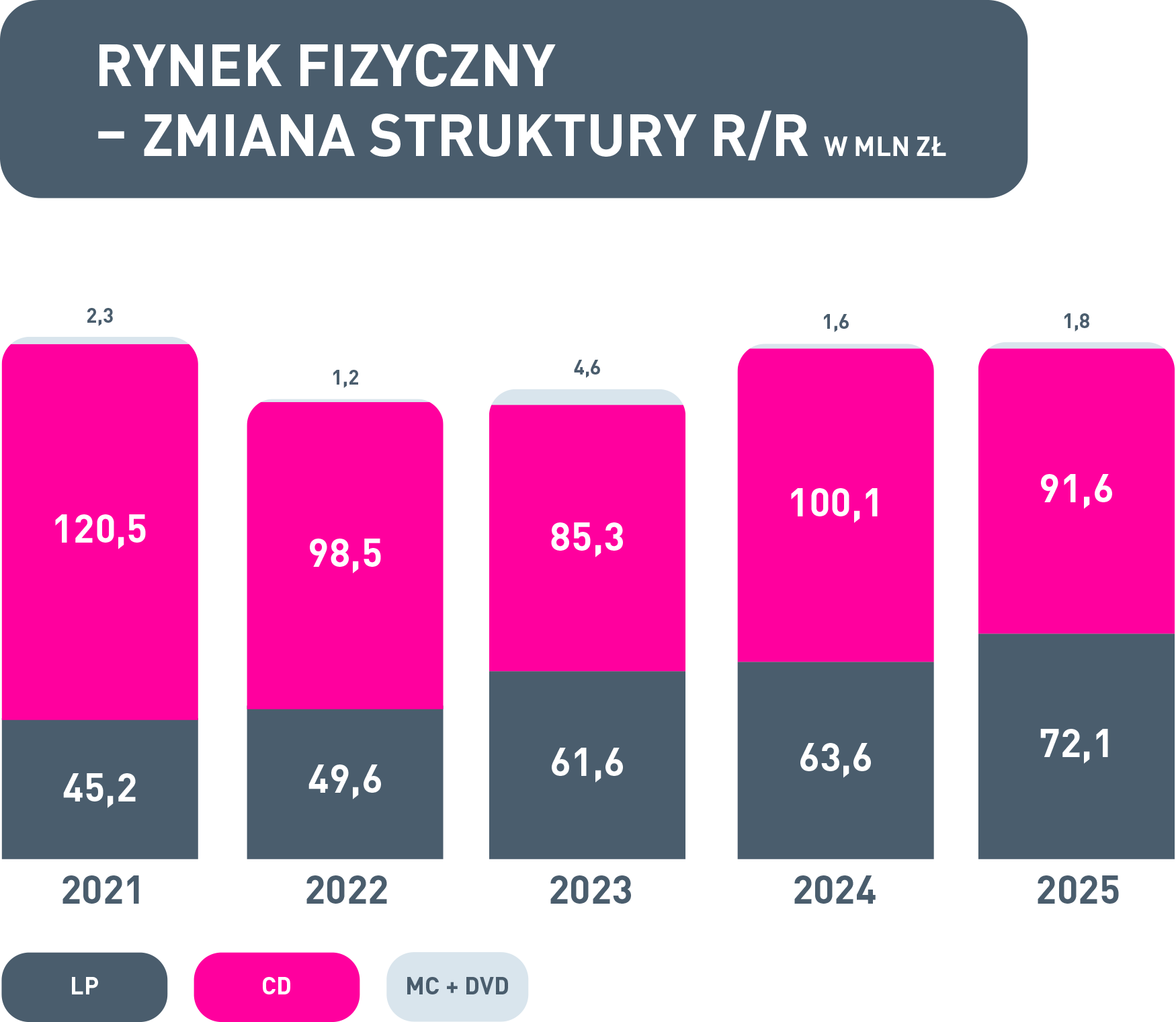 Z kolei sprzedaż płyt CD wyniosła 91,6 mln zł, notując spadek o 8,5% rok do roku. CD pozostaje największym segmentem sprzedaży fizycznej, jednak jego znaczenie maleje.