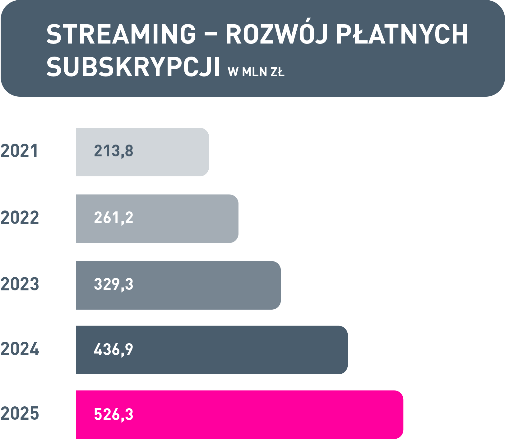 Największy udział ma streaming – odpowiada za 82,7% rynku, generując łącznie około 802,6 mln zł przychodów, z czego 526 mln zł, czyli blisko dwie trzecie przychodów cyfrowych, pochodzi z płatnych subskrypcji. Oznacza to, że już ponad 4 na 5 złotych wydawanych na muzykę w Polsce pochodzi ze streamingu.
